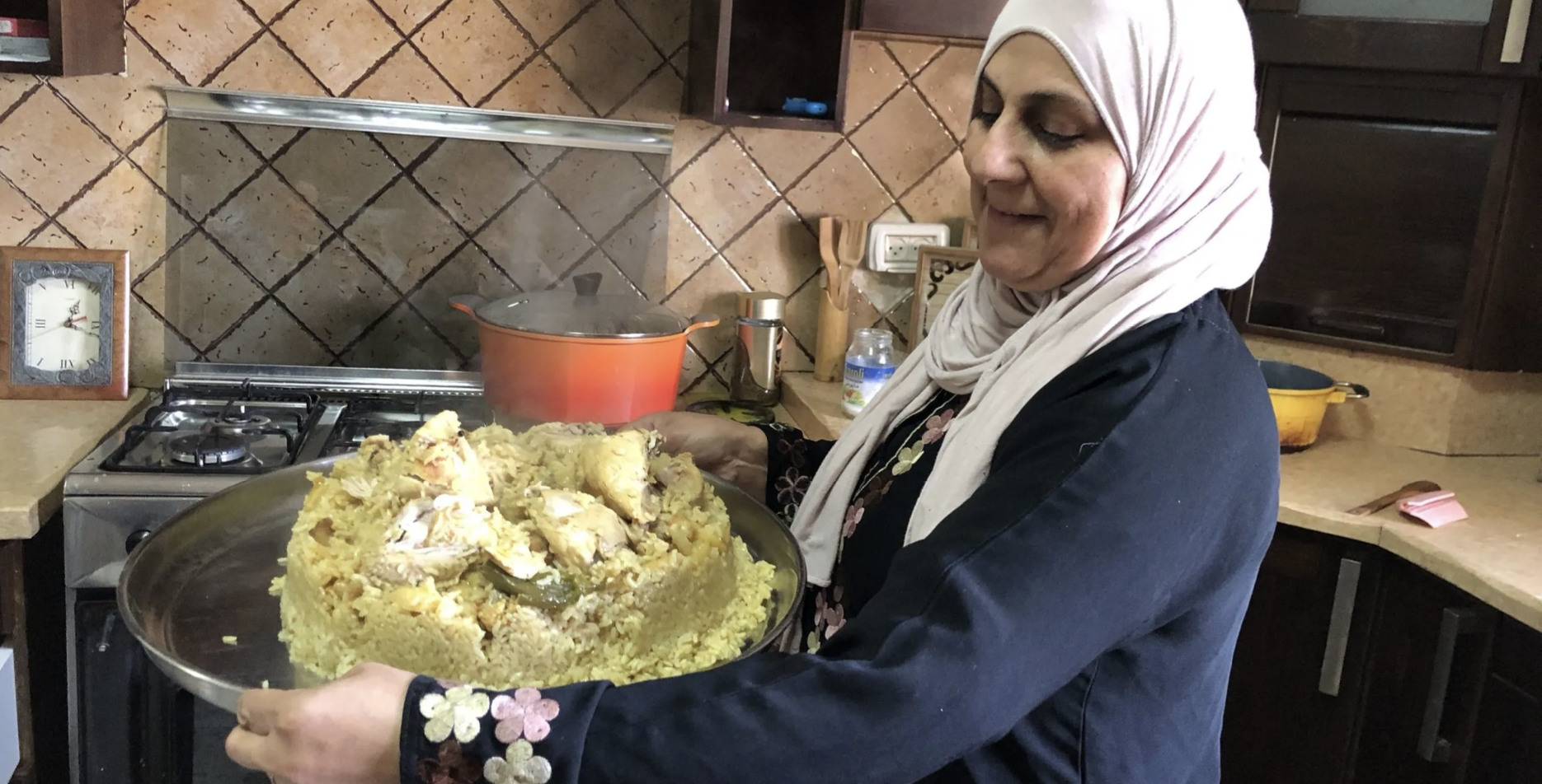 The 49-year-old mother-of-five is showing us how to make maqlubeh, a traditional Palestinian dish of meat, rice and vegetables flipped upside down – ‘upside down’ is the literal translation of the Arabic word.