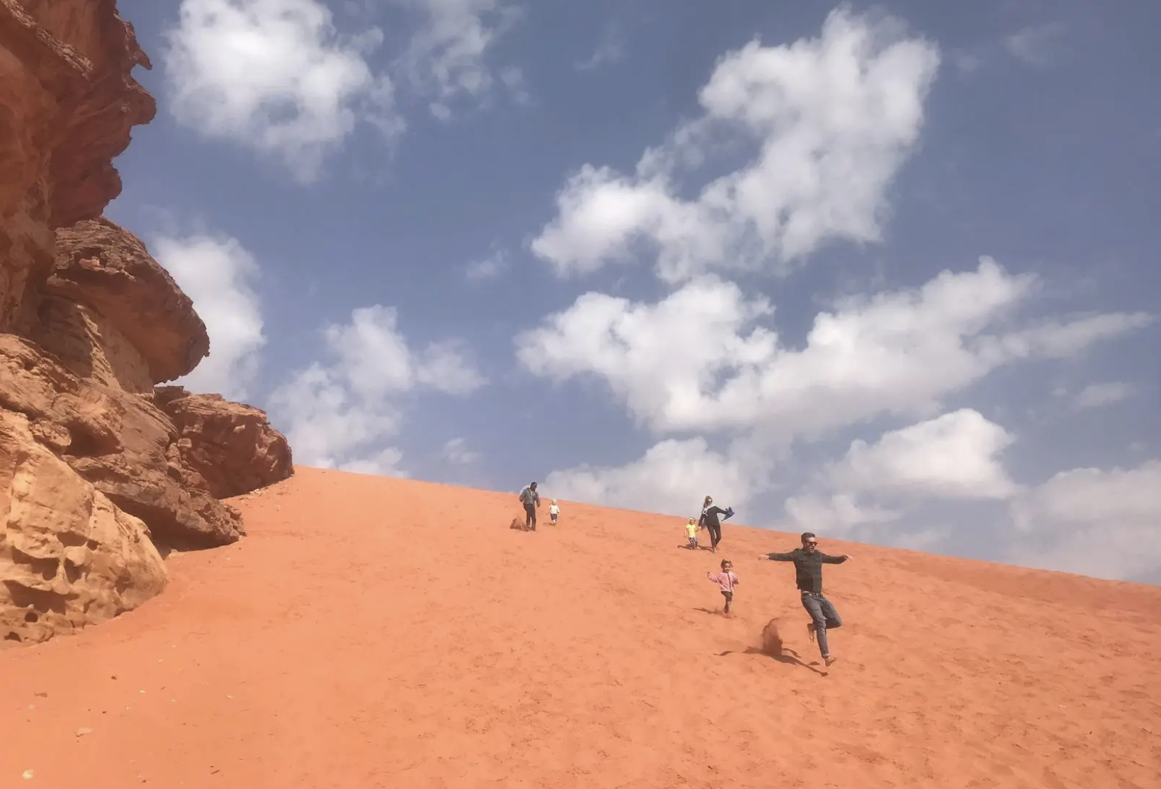 After a traditional Arab-style breakfast we’re off exploring. With six adults and five kids, we’ve booked two jeeps for a half- day tour. It’s not far to the first stop; the one we’ve all been waiting for! A huge red sand dune piled up high against the red rock.